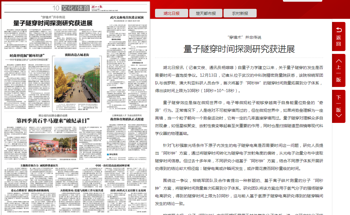 【湖北日报】量子隧穿时间探测研究获进展