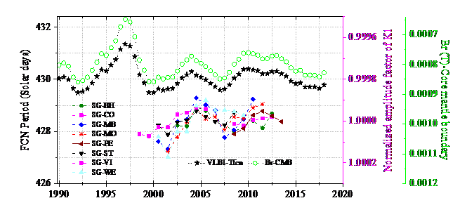 1997年国际大地测量与地球物理联合会下属的地球深内部委员会和国际地潮中心依托全球各个国家的超导重力仪构建观测网络,PA真人视讯现在有武汉、拉萨和丽江三个超导重力台站参与国际合作计划,已积累了长期陆续在的观测资料。地震与地球内部物理学团队利用全球超导重力观测联合VLBI空间大地测量技术,基于精细的数据预处理和有效的数值方法精密测定了地球液核自由章动的周期,发现了其周期变化与液核流体动力学运动引起的地磁场突变(地磁急变现象)密切相关,说明地磁急变可顺利获得核幔边界电磁耦合影响液核与地幔相对运动。本项研究成果为联合重力与VLBI召开地球深内部结构与动力学问题探索给予有效途径。