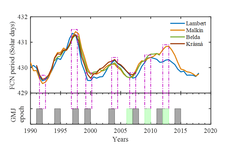 相关研究结果发表在20203月国际期刊Journal of Geodesy(doi: 10.1007/s00190-020-01367-7)上,副研究员崔小明为论文第一作者 ,论文题目为“Relationship between free core nutation and geomagnetic jerks”