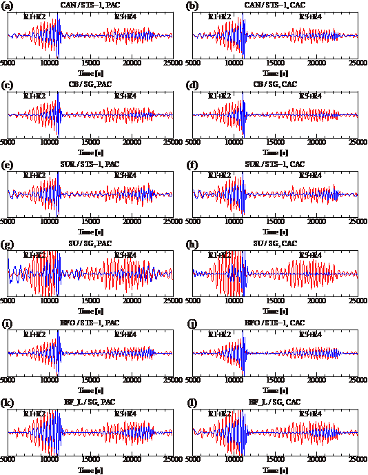 1 不同台站超导重力仪与地震仪同址观测到的地球长周期面波信号(SG表示超导重力仪,STS-1表示地震仪;红线表示未扣除地震影响的结果,蓝线表示扣除地震影响后的结果;PAC表示相位自相关方法,CAC表示传统自相关方法;CANCB、SURSU、BFOBF_L表示各同址观测台站)