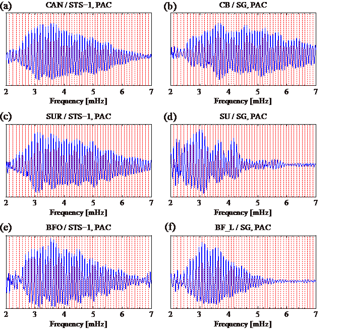 基于以上考虑,地震与地球内部物理学研究团队利用全球分布的超导重力仪和同址观测的STS-1地震仪长时间积累的观测资料,实施了精细的数据预处理与分析,并采用自相关方法提取了长周期面波(2-7.5mHz,即133.3-500s)和地球自由振荡,并对提取到的面波信号进行了群速度频散曲线的测量,顺利获得对两种不同观测技术得到的结果进行对比,验证了超导重力仪提取结果的可靠性。
