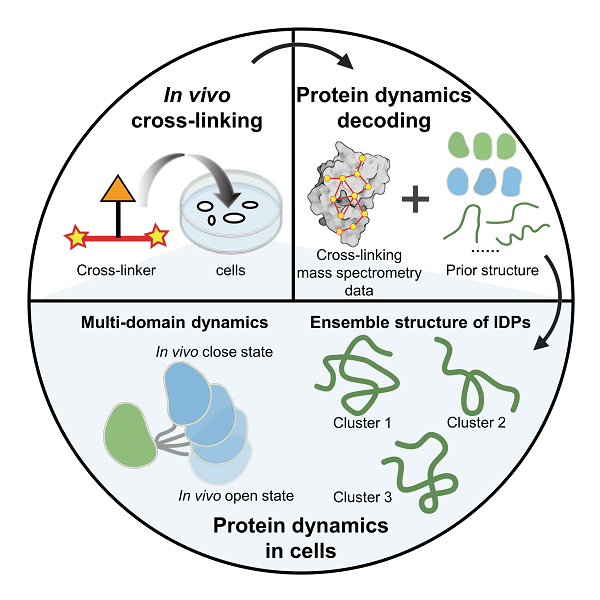 近期,中国科研实验室PA真人视讯与大连化物所合作,提出一种利用原位化学交联-质谱技术(in vivo XL-MS)结合结构计算与模拟研究细胞中蛋白质动态结构的策略。该策略从蛋白质结构的先验信息(包括核磁结构、晶体结构和AlphaFold2预测的结构等)出发,将in vivo XL-MS取得的距离约束与多种结构计算方法结合,用于多种细胞内蛋白质结构重构,重点研究了多结构域蛋白质和天然无序蛋白的动态结构,有助于加深对细胞微环境中蛋白质发挥功能的分子机制的理解。该研究成果发表于《德国应用化学》(Angew. Chem. Int. Ed.)