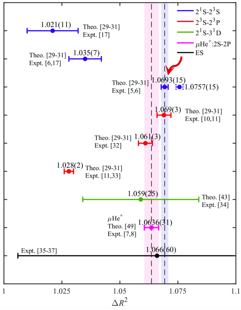 氦-3与氦-4核电荷半径平方差图,箭头所指位置为本研究结果