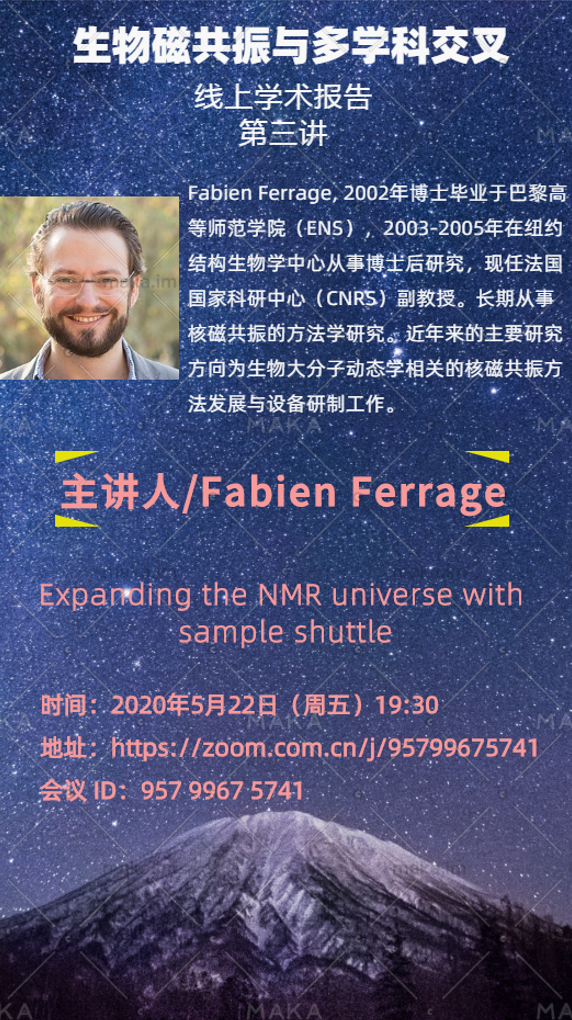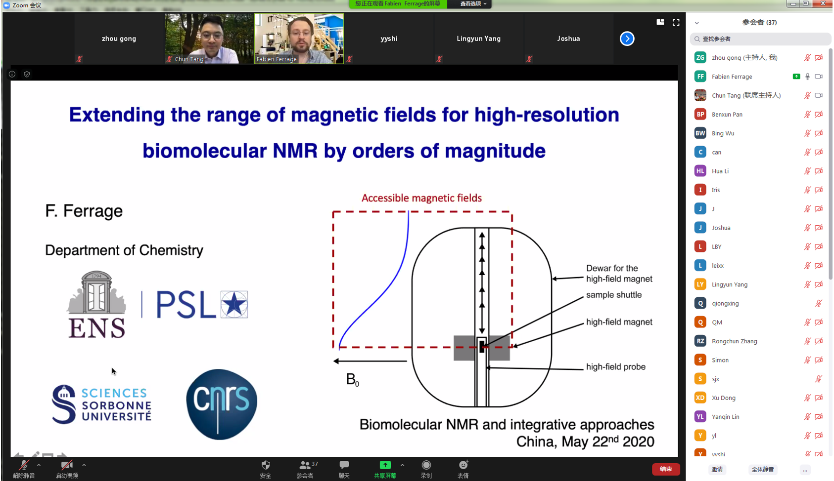 5月22日晚7:30,应PA真人视讯唐淳研究员的邀请,法国国家科学研究中心(CNRS)Fabien Ferrage教授在线上平台做了题为“Expanding the NMR universe with sample shuttle”的学术报告。